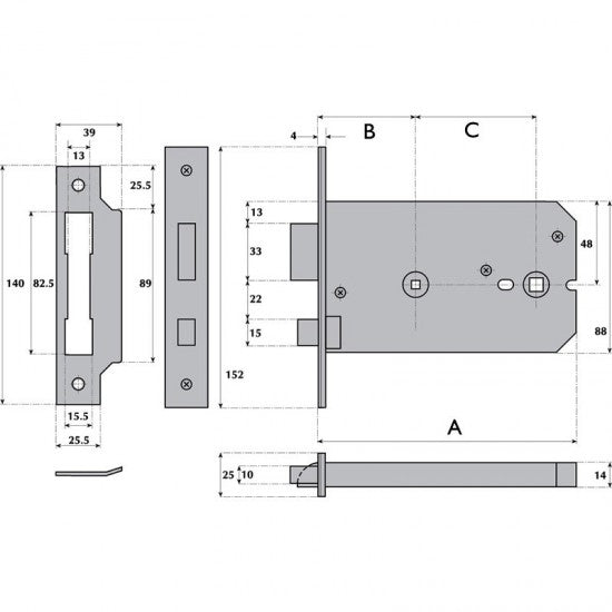 This bathroom horizontal mortice lock can be operated by a lever handle from either side and the deadbolt is operated by a turn from either side off a 5mm spindle.