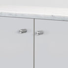 A pair of furniture knobs made from solid stainless steel. These knobs feature our signature, diamond-cut, linear knurl pattern and are refined by hand.