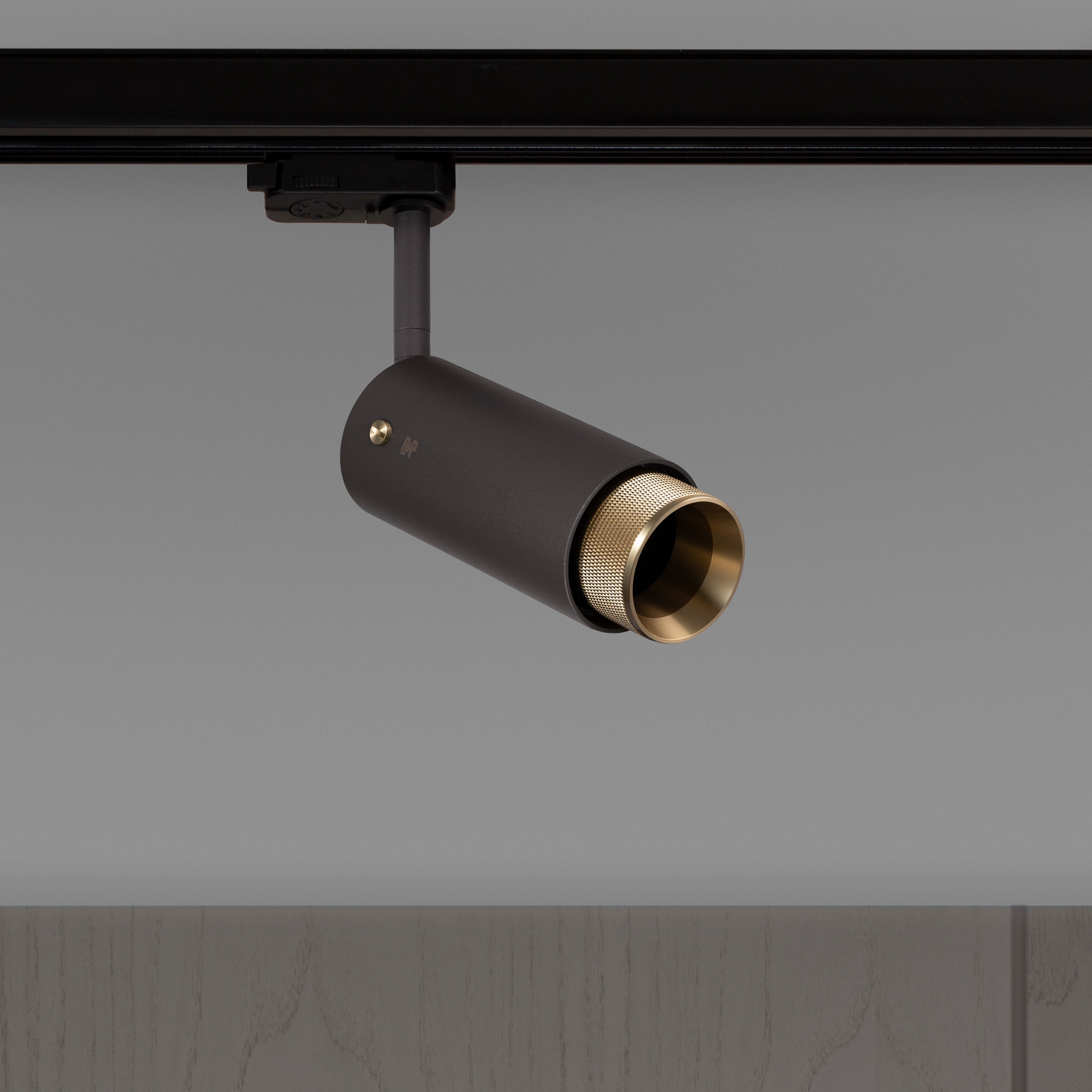 A track spotlight made from graphite powder coated metal with solid brass detailing.