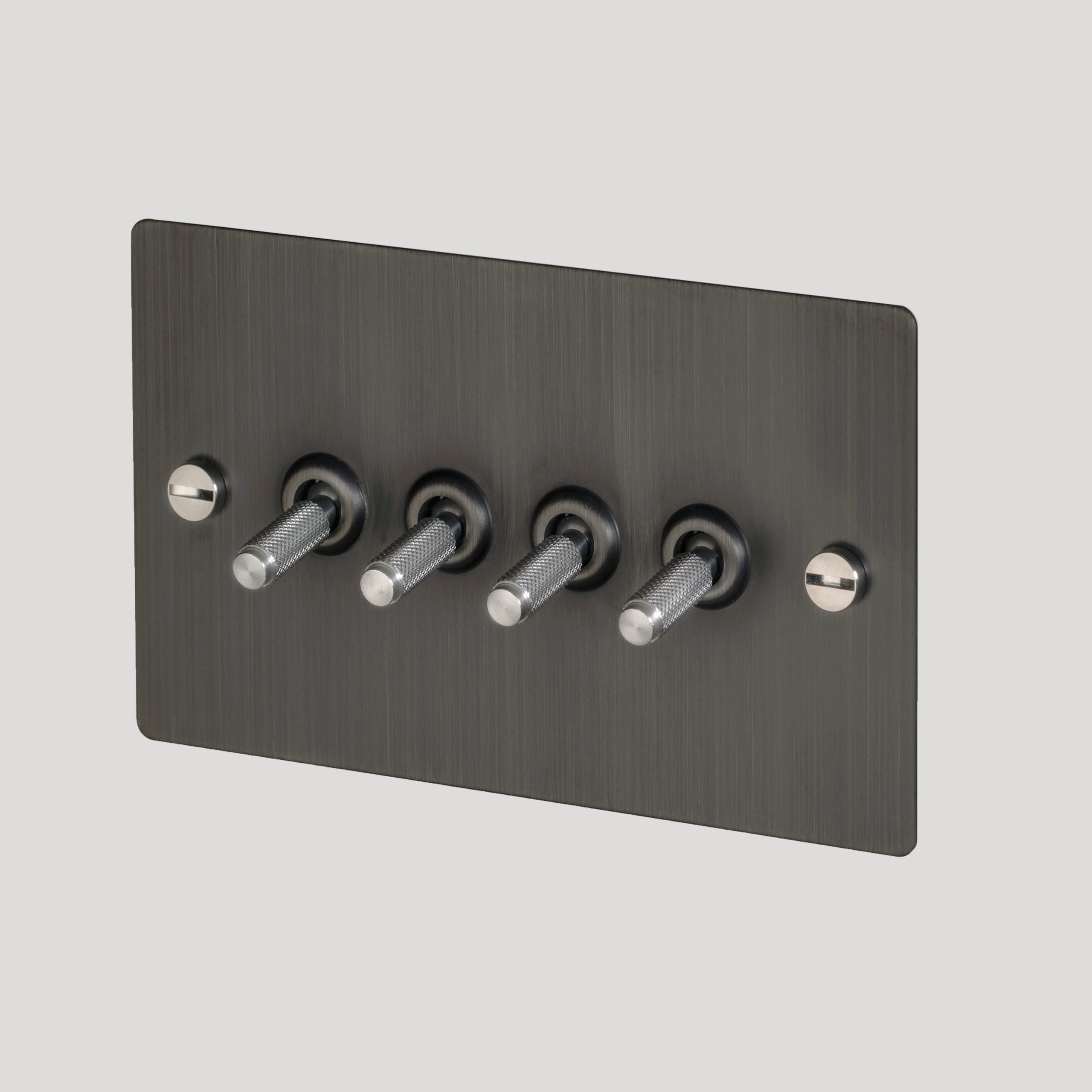A 4G toggle switch finished in smoked bronze. The toggle arm can be made from smoked bronze or brass and features our signature, diamond-cut, cross knurl pattern.