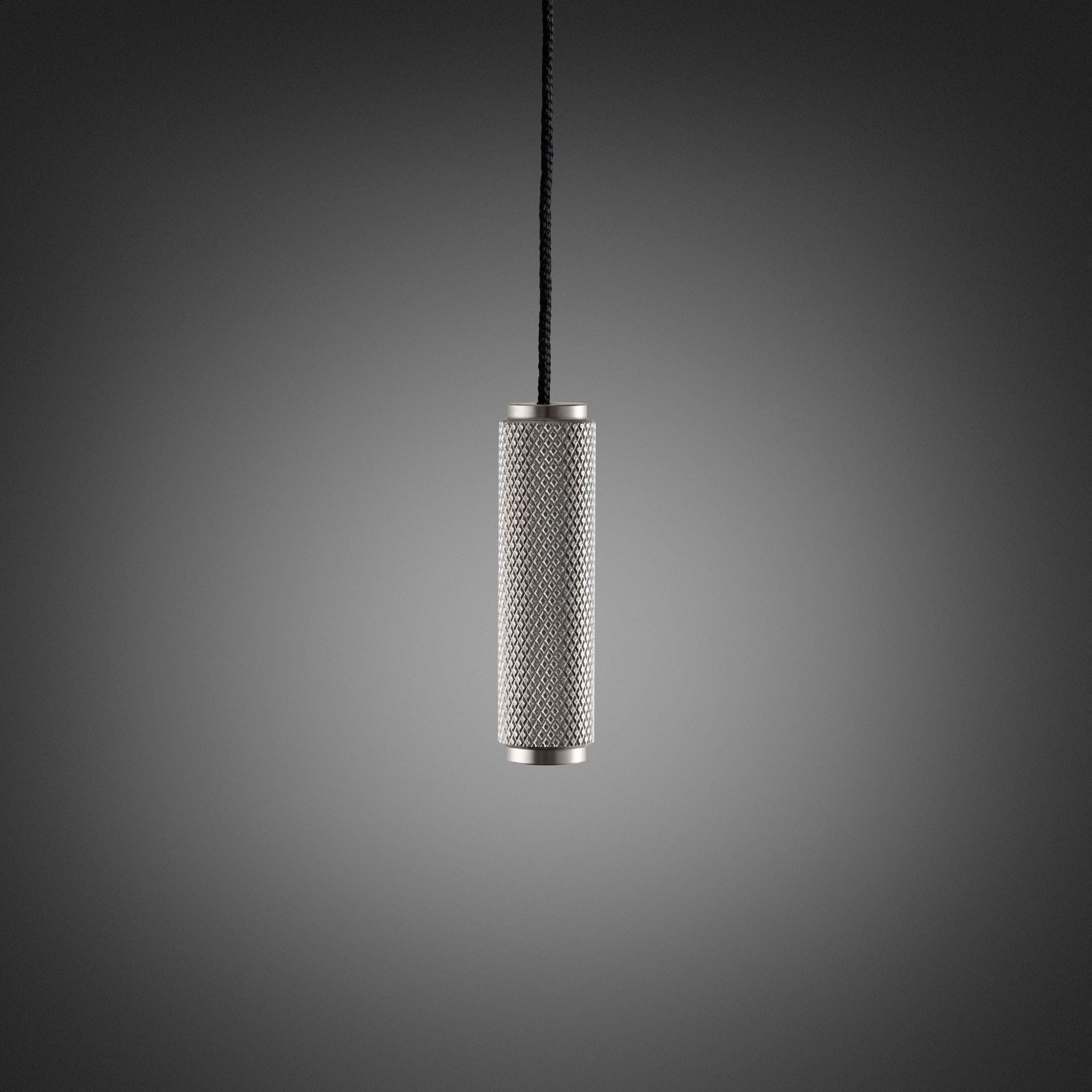 A surface-mounted ceiling switch with a solid metal pull, finished in steel, and featuring our signature diamond-cut knurling.