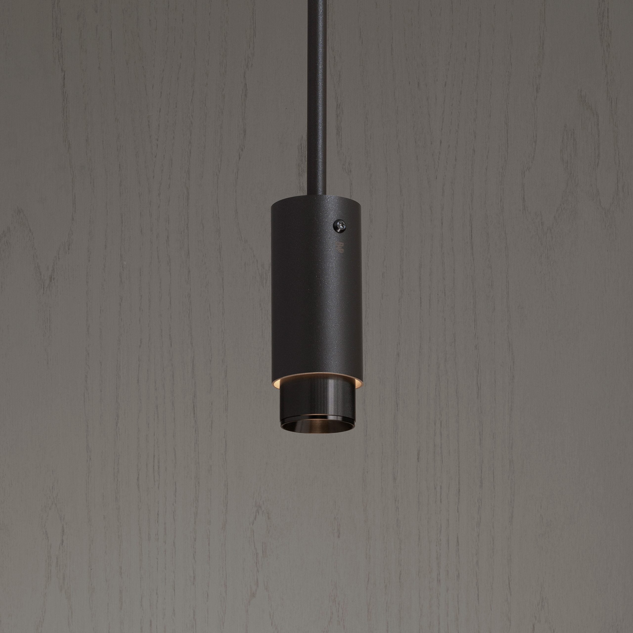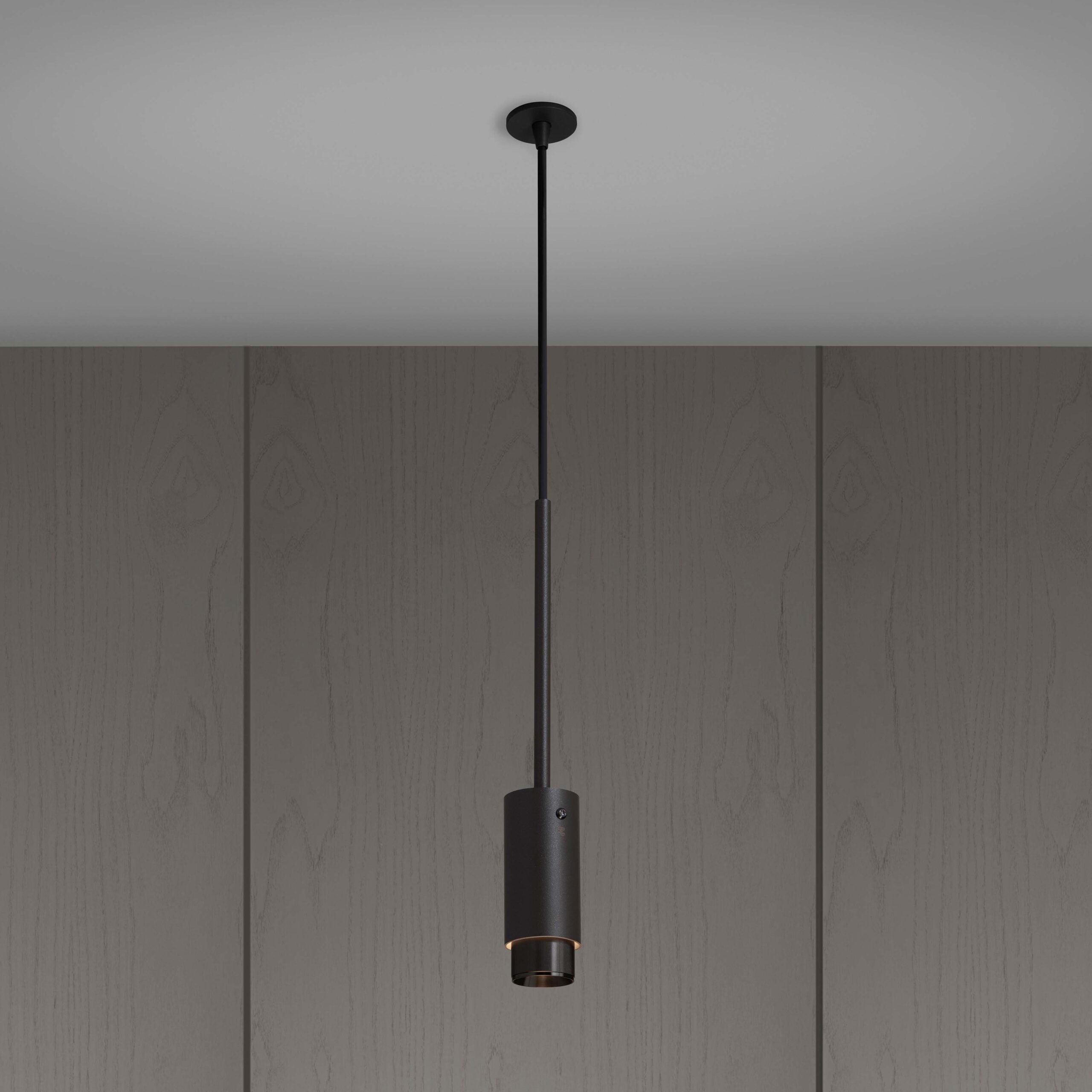 A pendant spotlight made from graphite powder coated metal with solid gun metal detailing.