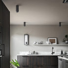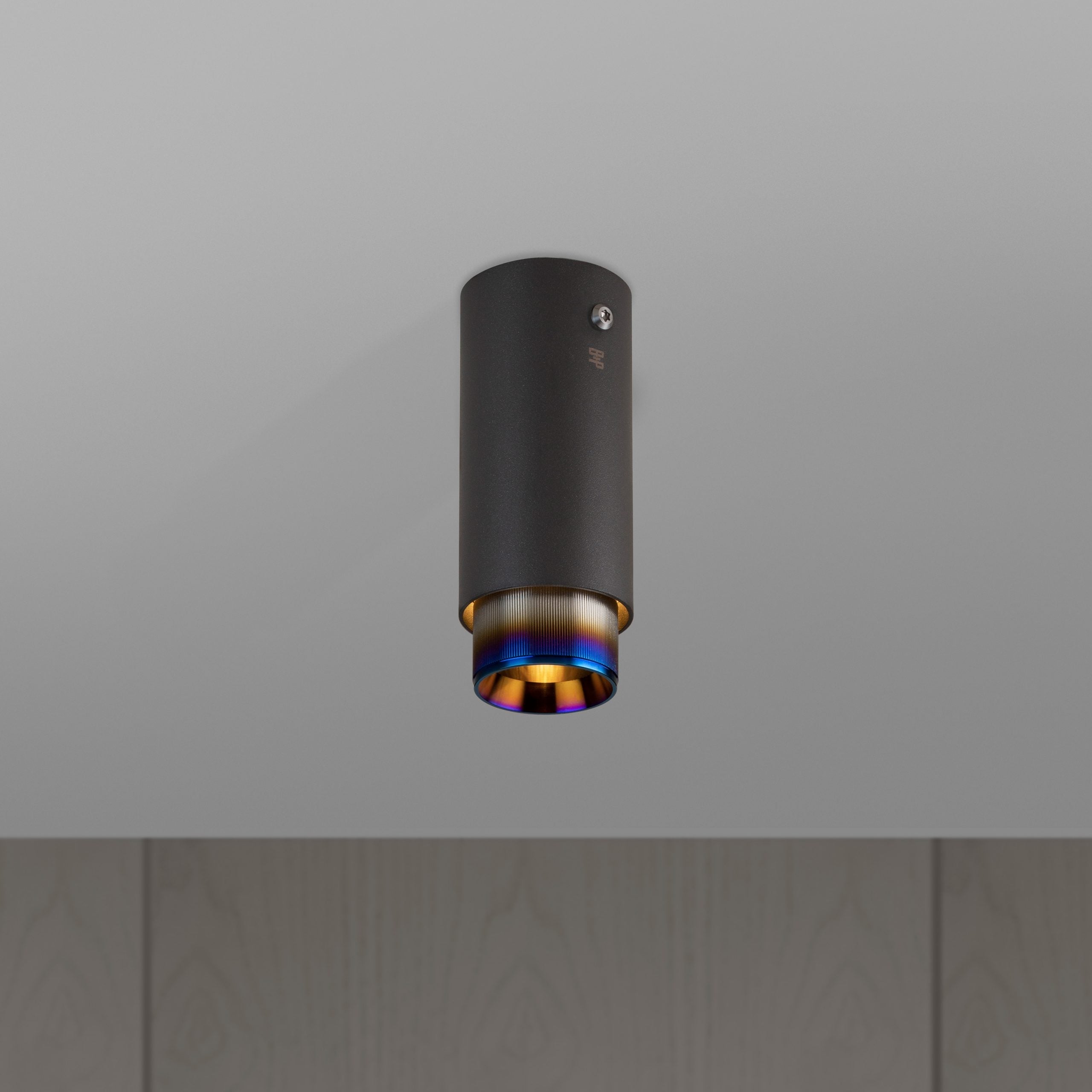 A surface mounted, fixed spotlight made from graphite powder coated metal with solid steel detailing.