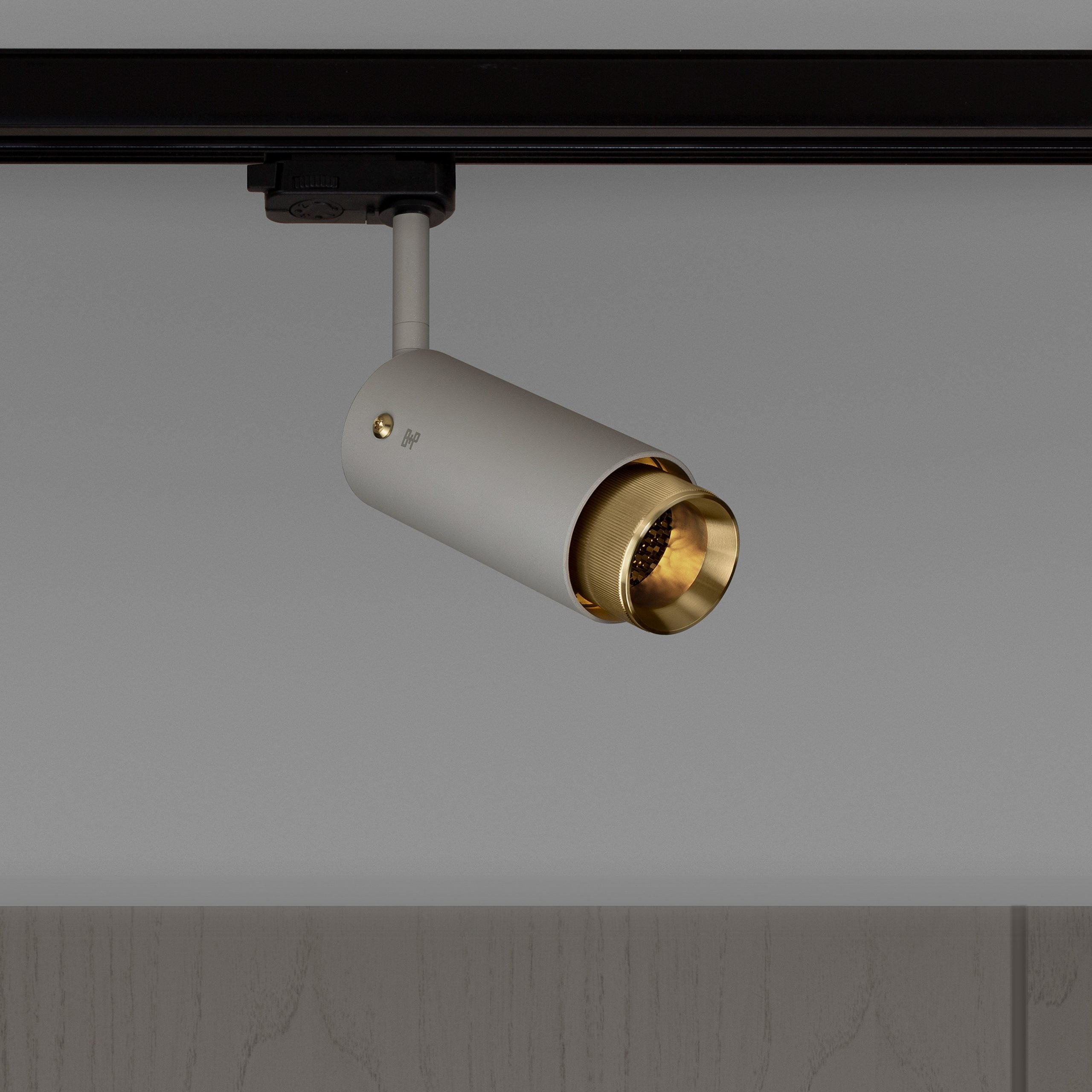 A track spotlight made from stone powder coated metal with solid brass detailing.