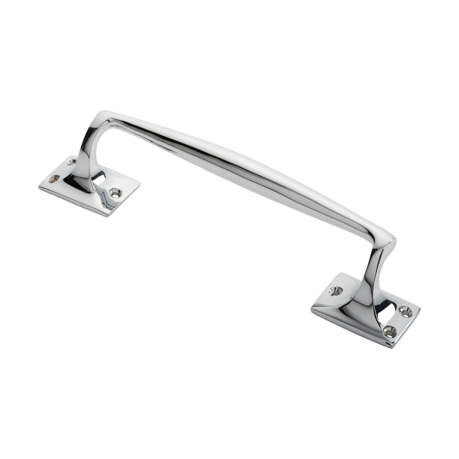A cast one piece pub style pull handle blending into square roses. The handle is slender at each end with a broader middle allowing for a comfortable ergonomic grip. The square roses have an elevated angular platform giving this a more detailed and pleasing appearance than standard. It is suitable for a range of applications in commercial settings.