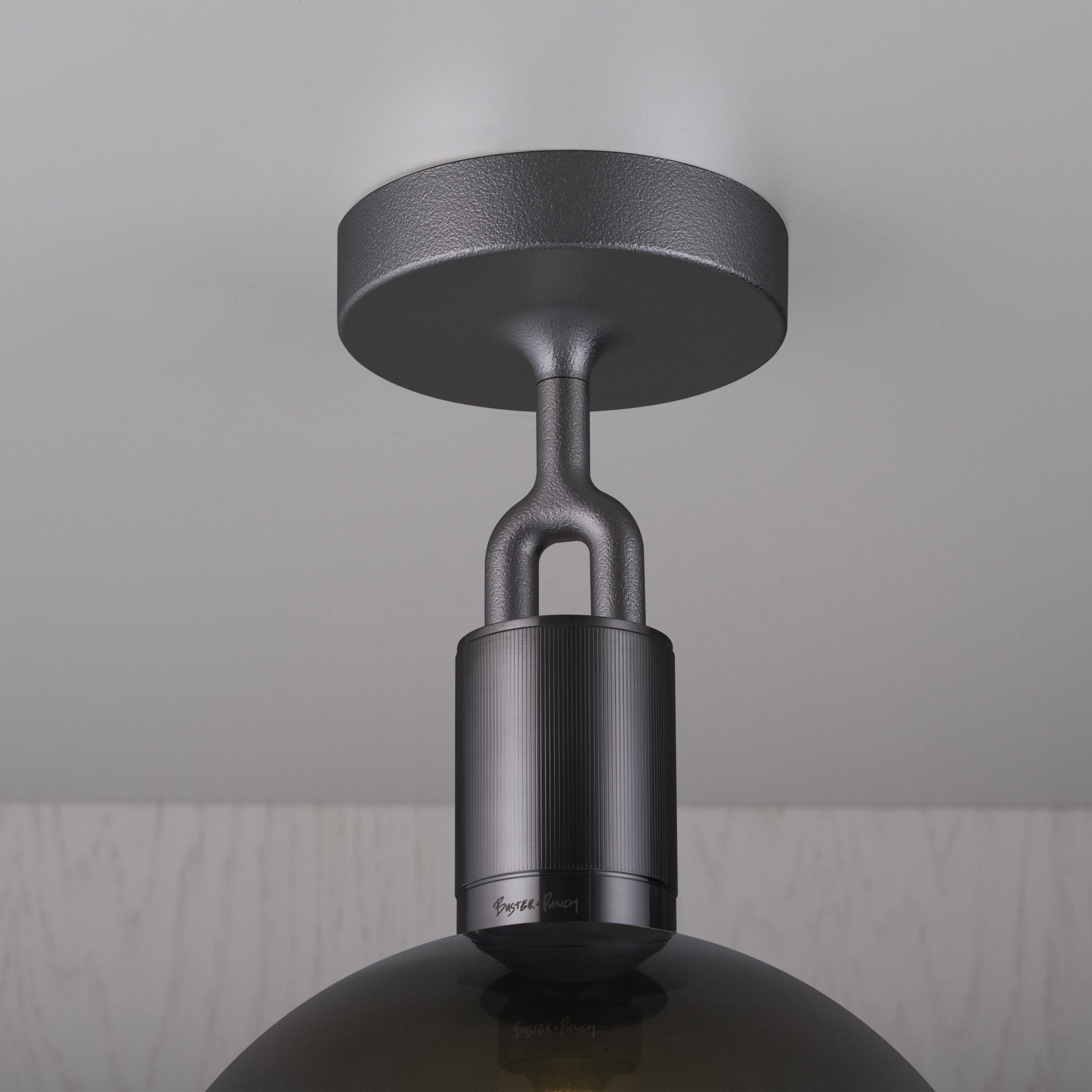 A ceiling light, combining machined and cast solid metal, all refined by hand. It features our cast forked detailing and signature diamond-cut linear knurling. The light comes complete with a hand blown opal glass globe and Forked-specific dimmable Buster Bulb, casting a functional ambient light in this configuration.